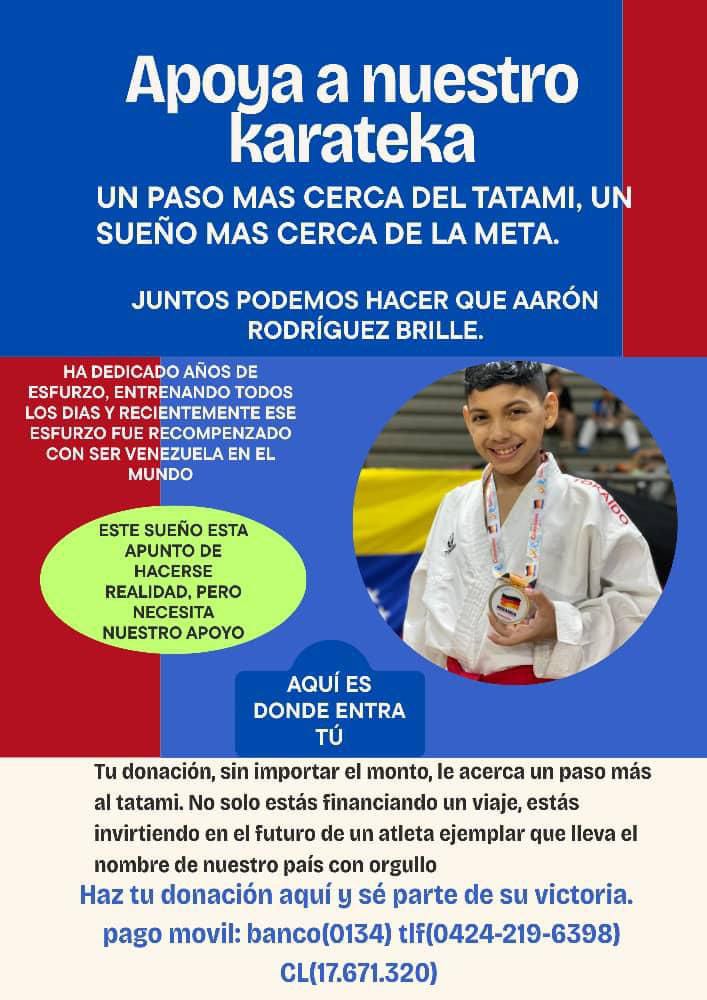 No solo estarás financiando un viaje, estarás invirtiendo en el futuro de un atleta ejemplar que lleva el nombre de nuestro país con orgullo, Haz tu donación aquí y sé parte de su victoria. pago movil: banco (0134) (0424-219.63.98) (17.671.320) o comunícate directamente con su madre al 0424-219.63.98